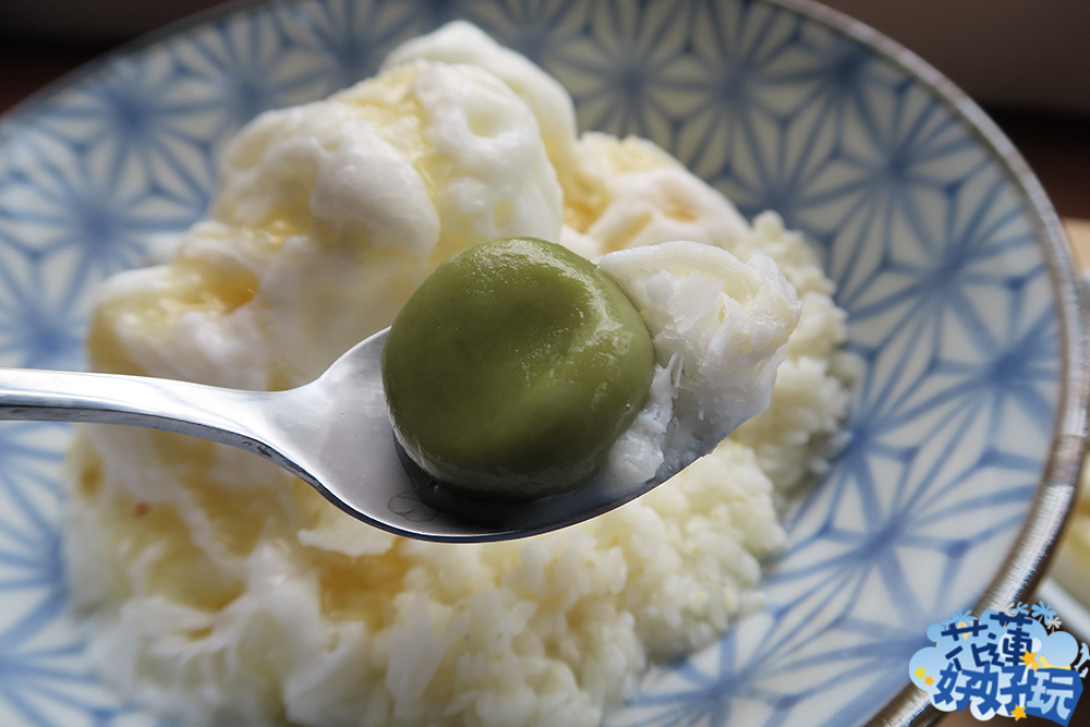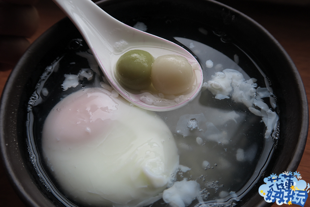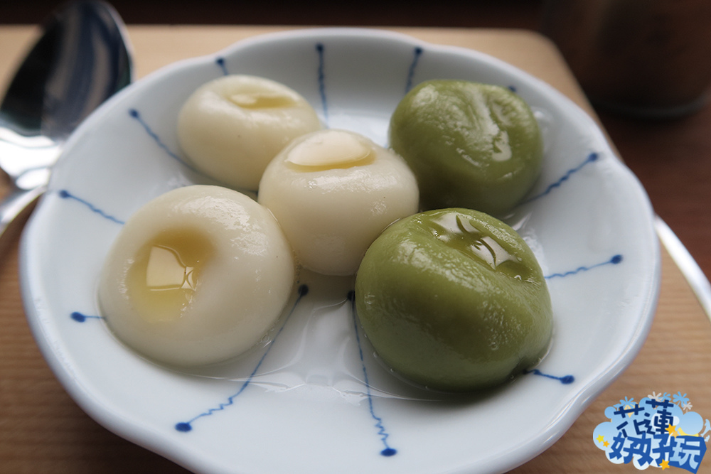為湯圓再加上小變化,除了傳統白色的,還用了日本的抹茶,變成綠湯圓,湯圓上方淋上桂花蜜,非常軟Q,淡淡的香甜