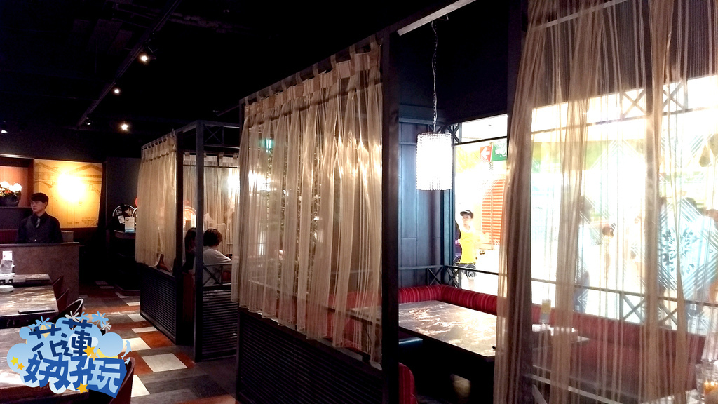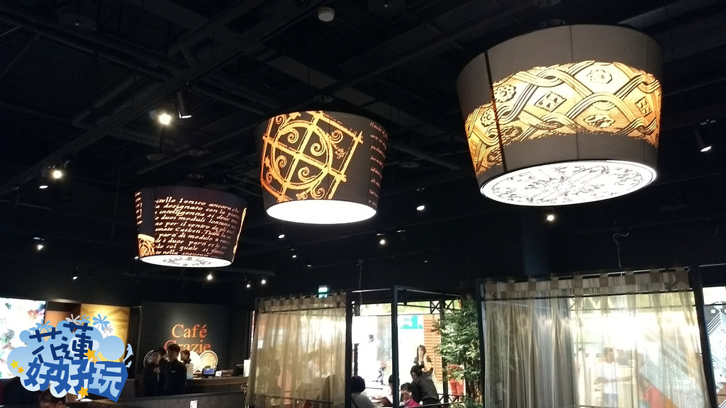 整體餐廳裝潢是以黑色系為主,搭配彩繪玻璃、壁繪、各種圖飾以及燈具妝點,雖說深色但並不會令人感到壓迫感。令小編喜愛的是進入店門口時,左側懸掛的三個大型燈飾,外型乍看之下令人聯想到天燈,然而上方的文藝復興風格構圖卻使得整盞燈具充滿義式風味。