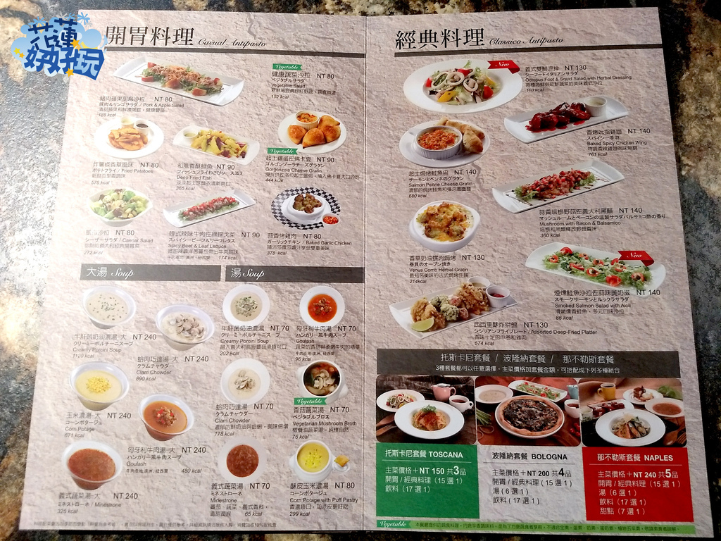 花蓮古拉爵有多人套餐的MENU,上方都有寫明點餐方式;無論是雙人、三人、四人甚至到五人、甚至是兒童套餐,都有相應的套餐配法(順道一提,兒童套餐到2017年8月底都有特價哦!)。而他們的多人套餐是屬於搭配式,就是每樣套餐可任意選定餐點配法,而非一貫定制,這點讓肥編非常喜愛!此次肥編是選擇三人份套餐「羅馬饗宴」……不,當然不是肥編一人吃三份,因為肥編有和朋友一起過去,所以才點了三人套餐,然後另加一份500元主餐安格斯牛排!另外菜單上都會附上該餐點的卡洛里數,可以給想要吃得輕盈無負擔朋友參考參考。