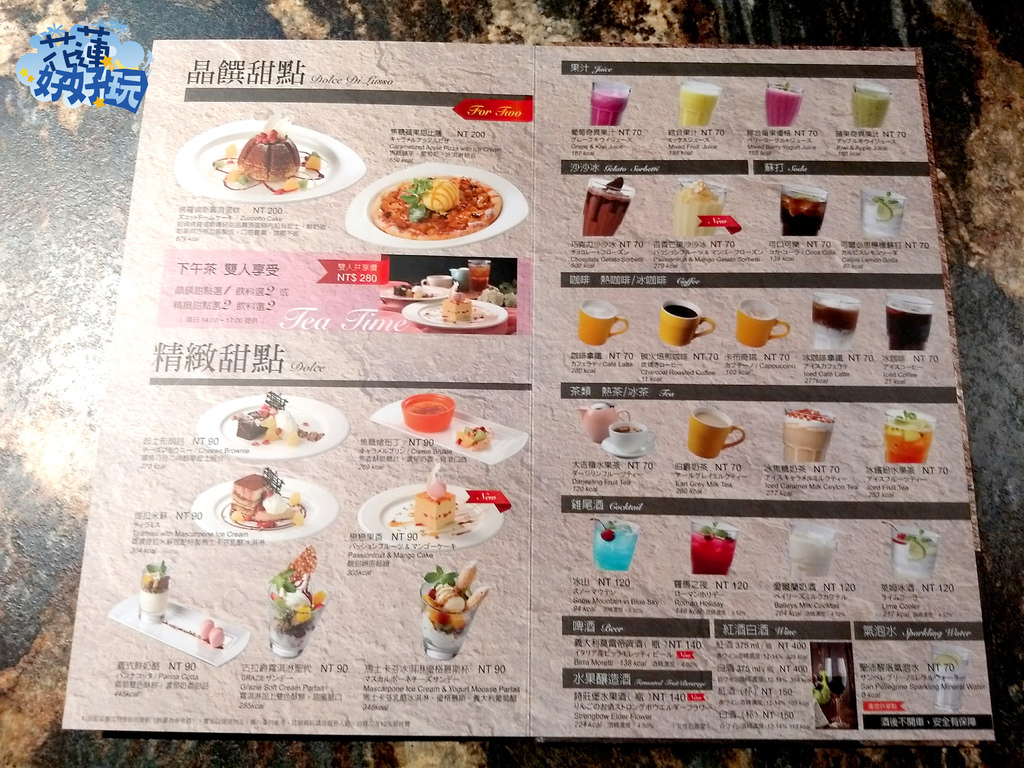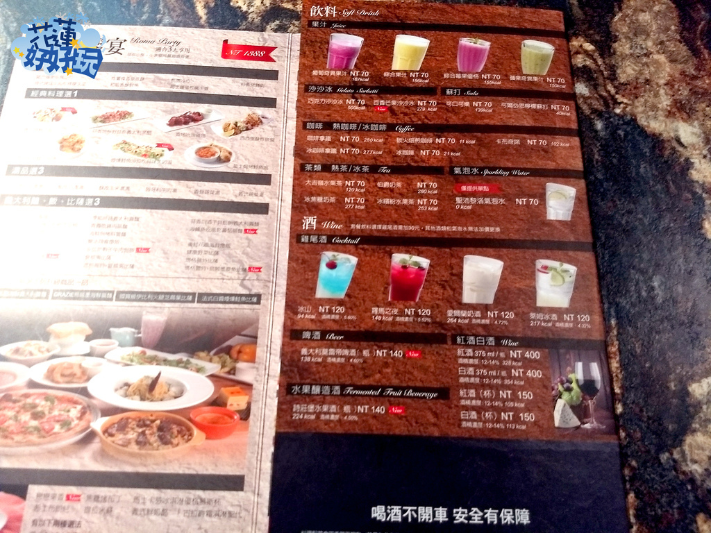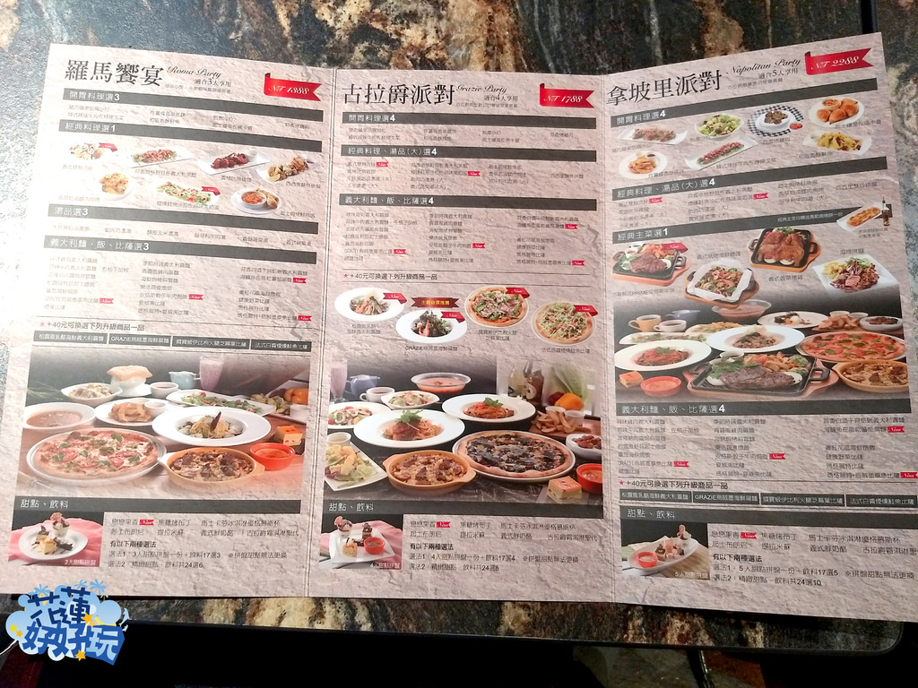 以「羅馬饗宴」三人套餐作介紹,價格為1,388元,內容大致可分為五類:「開胃菜、經典料理、湯品、主菜、甜點飲料」;份量分別是「開胃菜」任選3種、「經典料理」選1種(三人合吃的概念)、「湯品」任選3種、「主菜」(麵、飯和披薩)任選3種、「甜點飲料」任選6種;「甜點飲料」部分也可換成是任選3杯飲料+甜點拼盤,好處是甜點拼盤會有四種甜點,只是甜點是官配無法自訂。此處要注意若飲品改為調酒類,則會每份加收30元,而主餐部分也有加40元的升級類餐點。