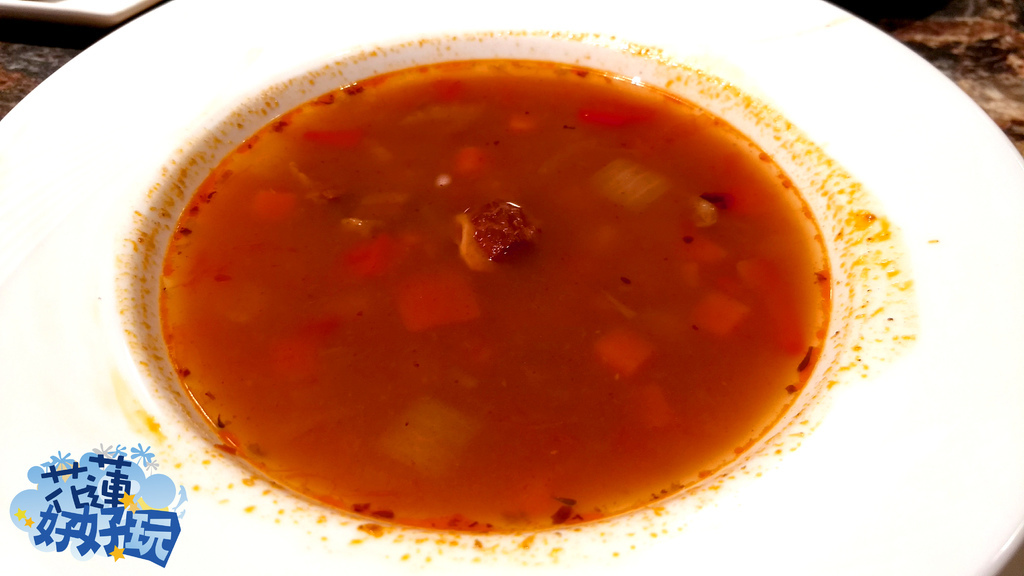 而在經典料理送上不久,便陸續來了「湯品和飲品」(湯和飲料會先來、甜點結尾才上),湯品我們是點了牛肝菌奶油濃湯、匈牙利牛肉湯和義式蔬菜湯。飲品方面則是冰拿鐵、巧克力冰沙以及葡萄奇異果汁。