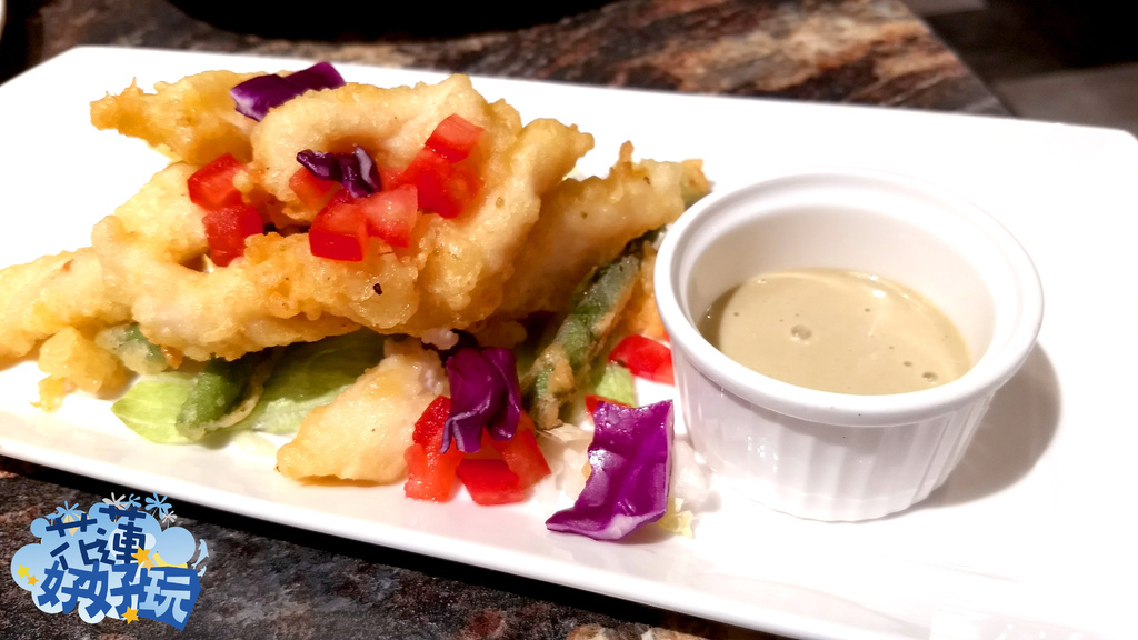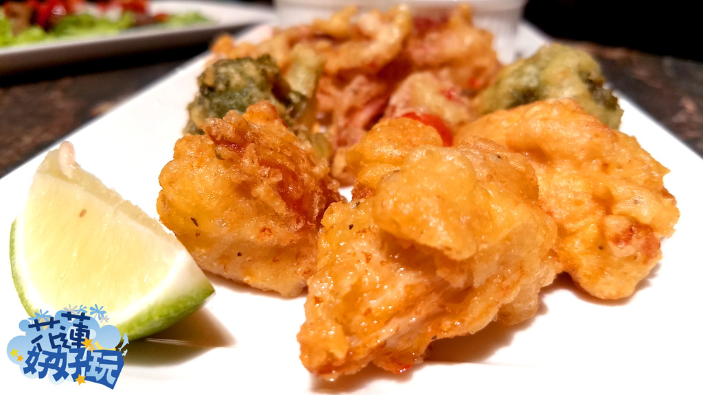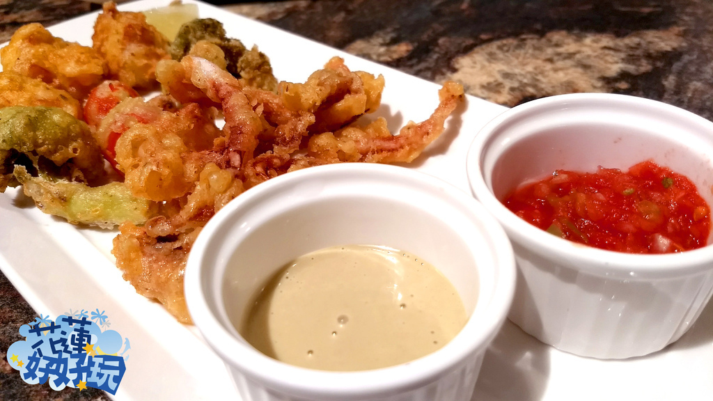 「經典料理」我們則是選西西里酥炸拼盤(高卡洛里94讚),菜色內容是酥炸中卷、雞肉,點綴花椰菜以及小番茄,另有附搭芥末醬、莎莎醬(Salsa…肥編都念騷莎)兩種不同口感的醬料,不得不說炸中卷配上芥末醬真是一絕啊!芥末可以將中卷的氣味提出,而用辣椒和番茄製成的騷莎醬搭配炸雞,讓口感更加爽口。