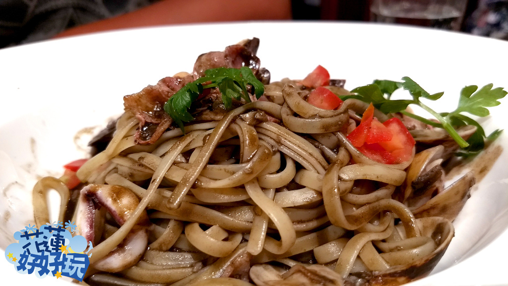 烏賊墨海鮮扁麵則是需要加價40元,但是肥編在此強推,沒吃過真的要吃上一次,墨魚汁是直接淋上義大利扁麵上,扁麵的每一口嚼感都溶入了墨魚汁的鮮味,搭上海虹和蝦子,絕對是一大享受。