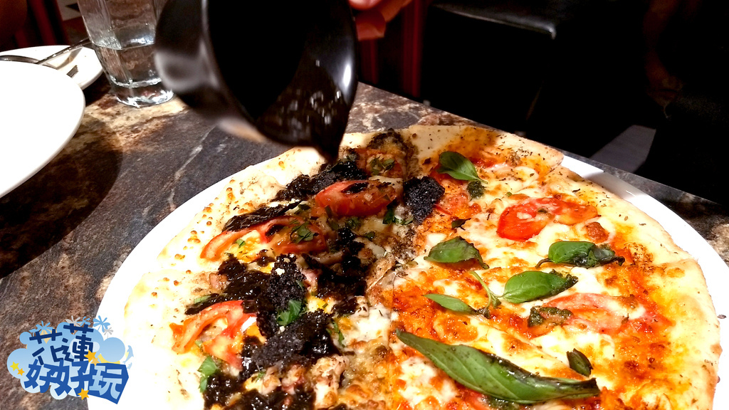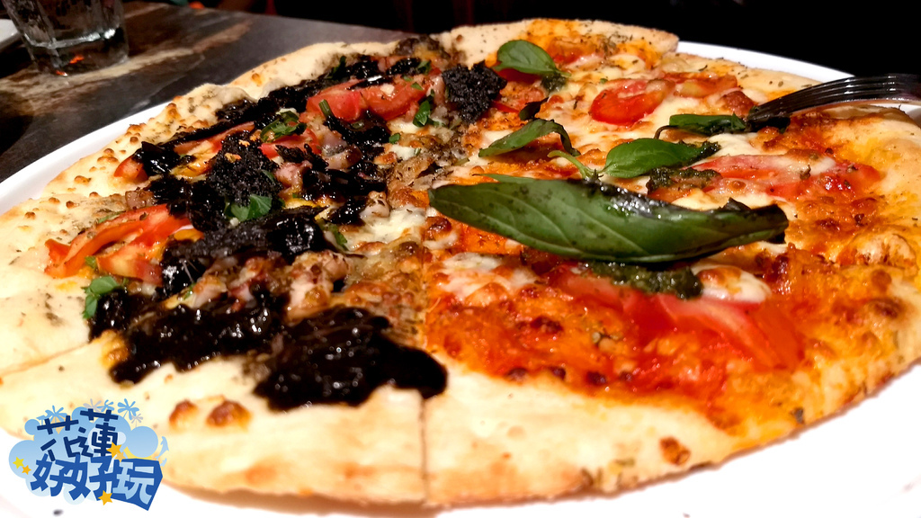 雙拼披薩的餅皮是小編喜愛的薄餅,而雙拼之一的瑪格麗特口味主要是用羅勒葉、白乳酪、番茄三種組成,據說是以義大利王妃瑪格麗特命名,主因是瑪格麗特王妃認為羅勒葉、白乳酪、番茄三種顏色有如義大利國旗的綠白紅三色而非常喜愛;烏賊墨章魚披薩的部分、當然主角就是後續淋上的烏賊墨汁,起司和墨汁香味很配,加上章魚的軟Q,肥編胃口大開!
