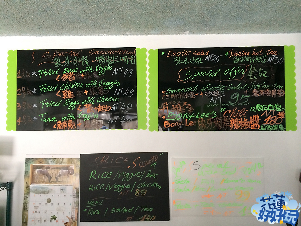 菜單直接在牆上,中英對照,有點小亂,大致就是三明治(套餐),單點49元,套餐95元。義大利麵(套餐),單點99元,套餐150元。飯(套餐),單點89元,套餐140元,口味上則可選豬、雞、魚,或蛋起司